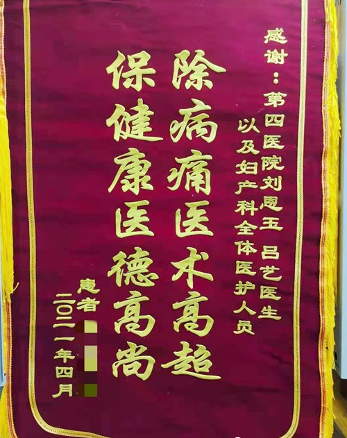 董女士帶著一面錦旗來到了婦產(chǎn)科,表達自己深深的謝意,她說:“感謝四院婦產(chǎn)科對我的幫助,讓我最大限度減少創(chuàng)傷,尤其出院以后的這段時間,主任和呂醫(yī)生也一直關(guān)注我的恢復(fù)情況,定期為我換藥,督促我加強護理。我心里特別感激!”