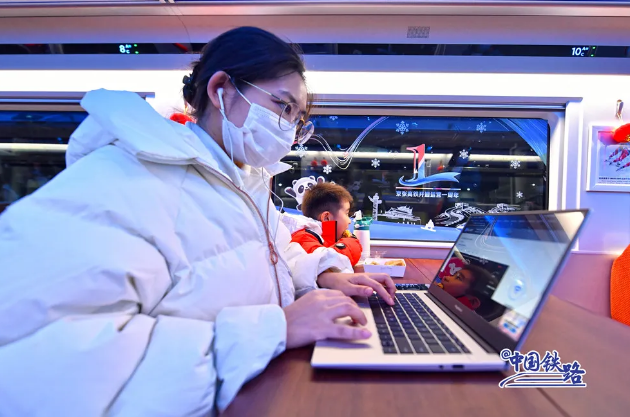 藍色的燈光、潔白的雪花、絢麗動感的車窗貼紙……在京張高鐵服役的復興號智能動車組將冬奧元素、運動精神和鐵路文化融為一體。