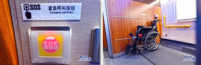 全列覆蓋免費高速Wi-Fi,旅客在旅行途中可以隨時使用電腦辦公、手機娛樂。車廂內(nèi)設有大件行李存放處、無障礙衛(wèi)生間等設施,并在殘疾人座位區(qū)配備輪椅固定裝置、SOS按鈕等。