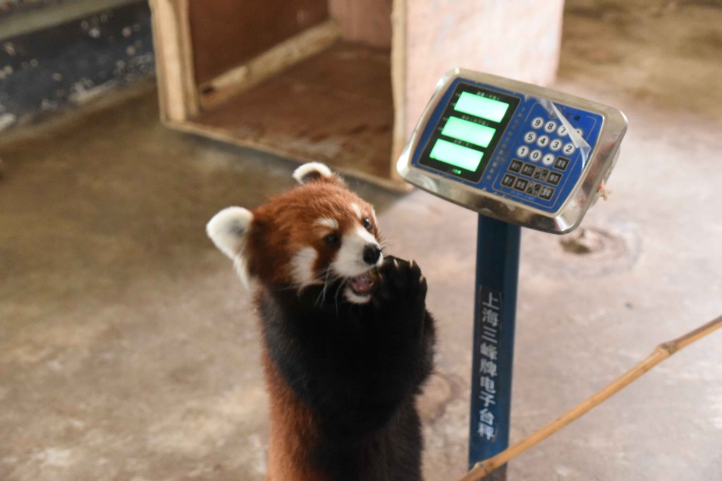 小熊貓對稱體重、量身高體長等體檢項目十分喜愛。因為飼養(yǎng)員們會用美食吸引它們走上體重秤,并在秤上直立身體量身高。小熊貓“小豆包”體檢時會展現(xiàn)出聰明又粘人的本性,抱住秤不撒爪,撒嬌賣萌很是可愛。