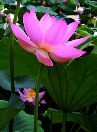 荷花凋謝前,花中心蕊開始長蓮蓬。秋天花瓣脫落,便留下蓮蓬,形狀似漏斗。蓬內(nèi)長著蓮子,成熟后顆顆飽滿凸起。荷梗是一枝中空管狀長梗,其外表生毛刺。荷花、荷蓋、蓮蓬都長在梗的頂端,夏天干挺,秋后干扁,并會曲折而斷。尖葉是葉蓋的初長之葉,兩頭尖,卷曲成筒形,梗短而細小,很優(yōu)美。