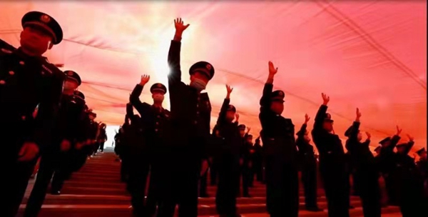 伴隨著激昂的樂曲,一面400平方米的巨幅黨旗緩緩展開,面向鮮紅的黨旗,在場(chǎng)的黨員干部和居民群眾心潮澎湃。100名黨員整齊列隊(duì),在領(lǐng)誓人的帶領(lǐng)下舉起右拳,莊嚴(yán)宣誓,重溫入黨誓詞,回望入黨初心,抒發(fā)對(duì)黨忠誠(chéng)的意志和信念。