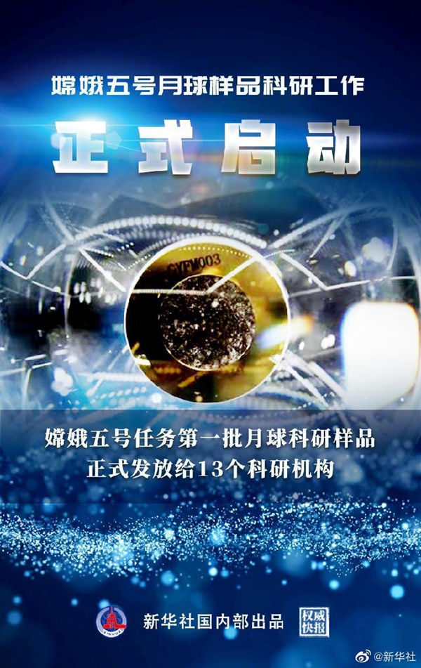 剛剛,國家航天局探月與航天工程中心在京舉行嫦娥五號任務(wù)第一批月球科研樣品發(fā)放儀式,標(biāo)志著月球樣品科學(xué)研究工作正式啟動。經(jīng)審核,來自13所科研機(jī)構(gòu)的31份申請獲得通過。(新華社記者 胡喆 海報(bào)設(shè)計(jì) 苗夏陽)