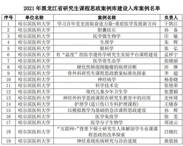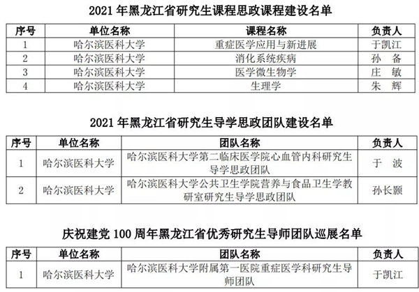 黑龍江經(jīng)濟網(wǎng)訊(黑龍江日報全媒體見習記者董廣碩 商祺)為貫徹落實國家《關于全面落實研究生導師立德樹人職責的意見》《高等學校課程思政建設指導綱要》《關于加快新時代研究生教育改革發(fā)展的意見》精神,按照《關于加快新時代黑龍江省研究生教育改革發(fā)展的實施意見》要求,日前,經(jīng)全省研究生培養(yǎng)單位遴選推薦,黑龍江省研究生課程思政教育聯(lián)盟專家委員會評審,省學位委員會、省教育廳批準,哈爾濱醫(yī)科大學共有26個項目獲批省級立項,其中研究生課程思政課程建設項目4個、研究生導學思政團隊(導師)建設項目2個、研究生課程思政案例19個,慶祝建黨100周年巡展優(yōu)秀研究生導師團隊1支。
