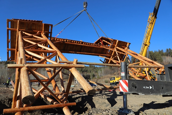 早上10點58分,只見平靜的林業(yè)局薩布素軍馬場頓時熱鬧了起來,兩臺大型起重機發(fā)動機嗡嗡作響,一東一西緩慢吊起10多噸重的大門,因偏向一側首次作業(yè)沒有成功。安裝技術人員調整重心點,第二次試舉,并在一臺裝載機的協(xié)助下,調整機位,歷時2個多小時,才將具有濃郁驛站文化風格的高10米、寬14米的木質大門,矗立在平地上。