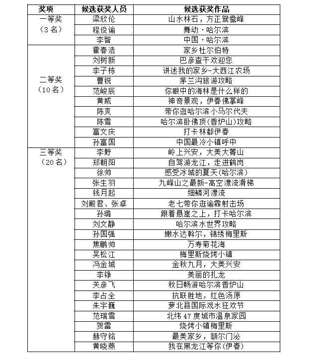 黑龍江文化旅游短視頻新媒體營(yíng)銷(xiāo)創(chuàng)作大賽獲獎(jiǎng)名單