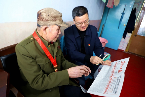 阿木爾林業(yè)局黨委委員、宣傳部部長(zhǎng)高樹(shù)源深入退休老黨員張俊峰家中,解讀黨的十九屆六中全會(huì)精神(王力 攝)