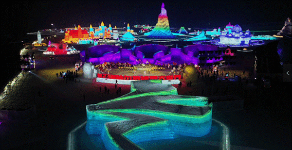 在30分鐘的暖場表演中,黑龍江哈爾濱、新疆阿勒泰、江蘇南京、廣東深圳等地舉行了慶?;顒?,并以連線的方式與暖場演出進(jìn)行互動。其中,哈爾濱的互動表演節(jié)目現(xiàn)場,選在了被譽為“黑龍江冰雪旅游名片”的哈爾濱冰雪大世界。