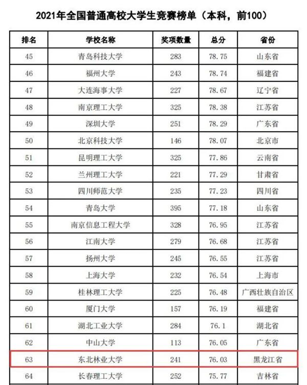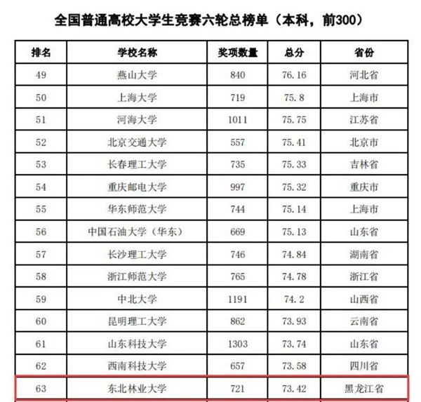 據(jù)悉,中國(guó)高等教育學(xué)會(huì)自2017年2月啟動(dòng)《高校競(jìng)賽評(píng)估與管理體系研究》項(xiàng)目以來(lái),中國(guó)高等教育學(xué)會(huì)已經(jīng)連續(xù)發(fā)布六輪榜單,這是我國(guó)第一個(gè)專(zhuān)注高校創(chuàng)新人才培養(yǎng)暨學(xué)科競(jìng)賽成果的排行榜,是檢驗(yàn)高校人才培養(yǎng)質(zhì)量的重要途徑。為從更長(zhǎng)的時(shí)間段了解各高校大學(xué)生競(jìng)賽發(fā)展態(tài)勢(shì),特在今年發(fā)布了“六輪總榜單”,時(shí)間跨度從2012年到2021年,東北林業(yè)大學(xué)以總分73.42,位列全國(guó)第63位。
