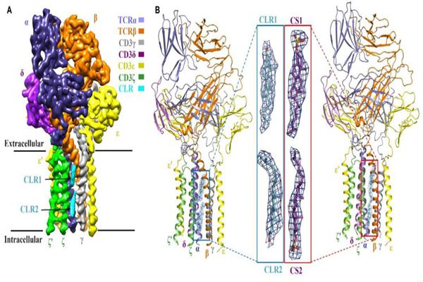 T細(xì)胞是脊椎動(dòng)物適應(yīng)性免疫的重要細(xì)胞,在病毒感染、癌癥以及自體免疫疾病中起著關(guān)鍵作用。T細(xì)胞通過(guò)其TCR-CD3受體復(fù)合物特異性識(shí)別抗原,將胞外的抗原識(shí)別信號(hào)跨膜傳遞到T細(xì)胞內(nèi),激活胞內(nèi)的適應(yīng)性免疫信號(hào)通路,啟動(dòng)免疫反應(yīng)。2019年,該課題組在《自然》(Nature)上發(fā)表了題為“人T細(xì)胞受體-共受體復(fù)合物組裝的結(jié)構(gòu)基礎(chǔ)”(Structural basis of assembly of the human TCR-CD3 complex)的研究文章,首次解析了人T細(xì)胞受體復(fù)合物(包含全部8個(gè)亞基)的高分辨率冷凍電鏡結(jié)構(gòu),揭示了TCR-CD3亞基在膜外側(cè)以及膜內(nèi)識(shí)別、組裝成功能復(fù)合物的分子機(jī)制。但一直以來(lái),T細(xì)胞受體如何將胞外抗原信號(hào)傳遞到胞內(nèi)激活T細(xì)胞的這一關(guān)鍵機(jī)制的結(jié)構(gòu)基礎(chǔ)并不清楚。