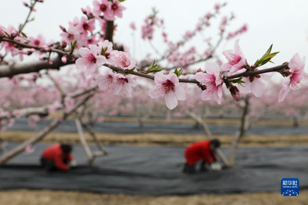 4月5日,在江蘇省淮安市洪澤區(qū)東雙溝鎮(zhèn),農(nóng)民在桃園里勞作。