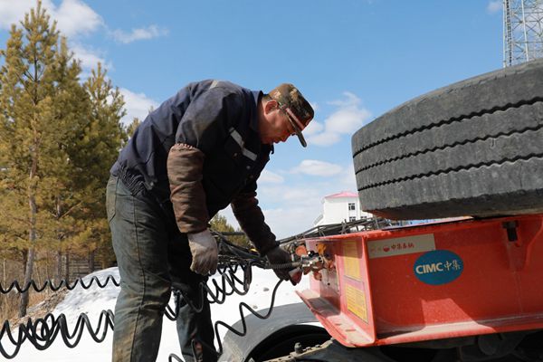 阿木爾林業(yè)局多種經(jīng)營(yíng)公司職工在保養(yǎng)拖掛車的制動(dòng)系統(tǒng)(王力 攝)