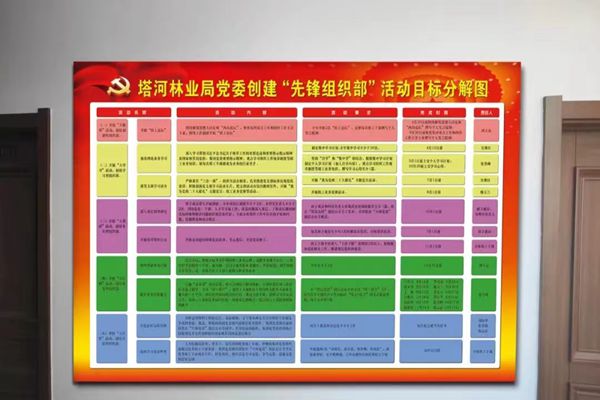 掛圖“作戰(zhàn)”,統(tǒng)籌指導(dǎo)。塔河林業(yè)局黨委組織部結(jié)合自身實(shí)際制定了《塔河林業(yè)局黨委創(chuàng)建“先鋒組織部”實(shí)施方案》;緊緊圍繞集團(tuán)黨委下發(fā)方案中的“五大”活動(dòng)和九項(xiàng)具體工作內(nèi)容制定目標(biāo)分解展示圖,詳細(xì)列出了活動(dòng)內(nèi)容、活動(dòng)要求、完成時(shí)限,秉承誰具體負(fù)責(zé),誰統(tǒng)籌推進(jìn),誰跟蹤問效的的原則,將責(zé)任落實(shí)到人頭,時(shí)刻督促每名組工干部及時(shí)完成目標(biāo)任務(wù),凝心聚力,共同打造講政治、重公道、業(yè)務(wù)精、作風(fēng)好的組工干部隊(duì)伍。