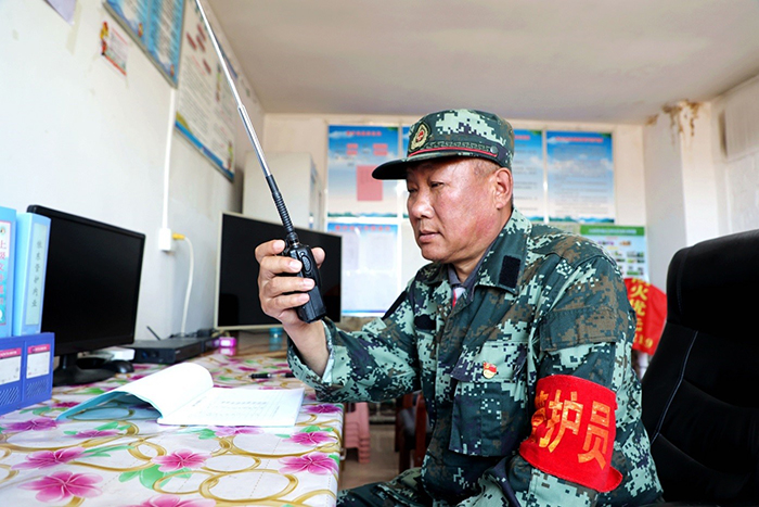 共產(chǎn)黨員、管護員滿德江在向阿防指匯報工作情況。(王力 攝)