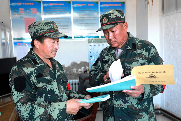共產(chǎn)黨員、管護員滿德江叮囑“戰(zhàn)友”張振東把記錄本記好。(王力 攝)