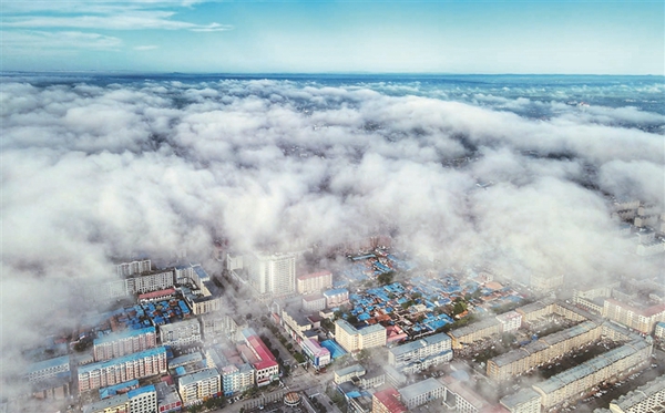 7日,雨后的龍江縣出現(xiàn)平流云景觀(guān)。清晨,大面積平流云從龍江縣龍江鎮(zhèn)上空飄過(guò),潔凈的街路、青翠的田野掩映其間,若隱若現(xiàn),蔚為壯觀(guān)。