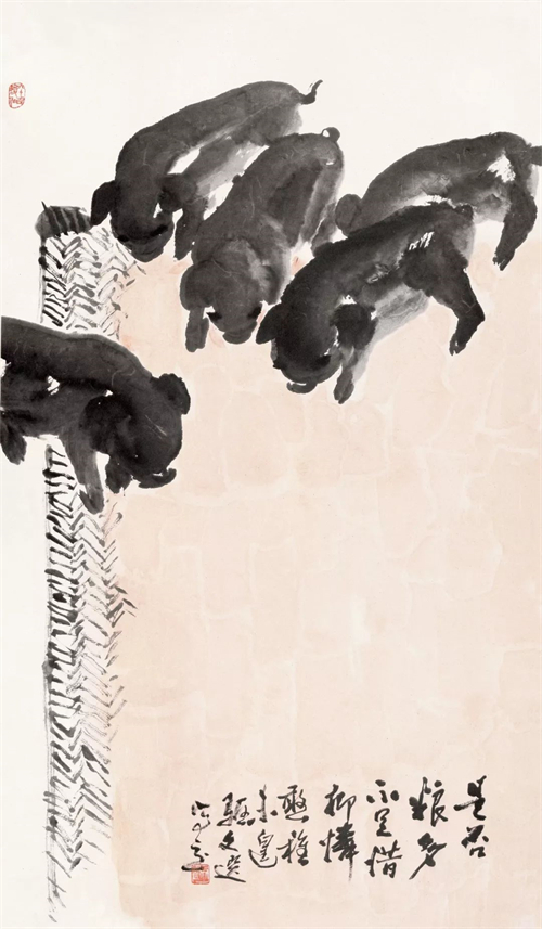 湯文選的人物、山水、花鳥、墨虎等一系列作品,融會著、貫穿著“三種傳統(tǒng)”。或隱或顯,或化解之,或凝聚之,或熔裁之,或獨造之?!叭N傳統(tǒng)”,可概括為現(xiàn)實主義在中國畫發(fā)展歷程中的三段式,亦曰交叉出現(xiàn)的不同歷史內(nèi)涵、文化反映的三種藝術(shù)狀態(tài):首先,是古代現(xiàn)實主義傳統(tǒng)——“外師造化,中得心源”。其二,是“五四”現(xiàn)實主義傳統(tǒng)——融合西法,崇尚寫實。其三,是新中國成立后倡導(dǎo)的革命現(xiàn)實主義傳統(tǒng)。深入火熱斗爭,深入工農(nóng)兵。學(xué)習(xí)延安木刻,學(xué)習(xí)民間年畫,學(xué)習(xí)蘇聯(lián)油畫現(xiàn)實主義的創(chuàng)作方法(50年代)。其后,“一手伸向生活,一手伸向傳統(tǒng)”(60年代)。在以上“三種傳統(tǒng)”的交匯點上,伸延出湯文選早期和中期的現(xiàn)實主義創(chuàng)作之路。湯文選中國畫藝術(shù)的現(xiàn)實主義,其主要特征為積極的入世態(tài)度,強(qiáng)烈的人文主義色彩,個性、民族性與時代性的完美統(tǒng)一,以及嚴(yán)肅的歷史使命感。
