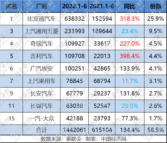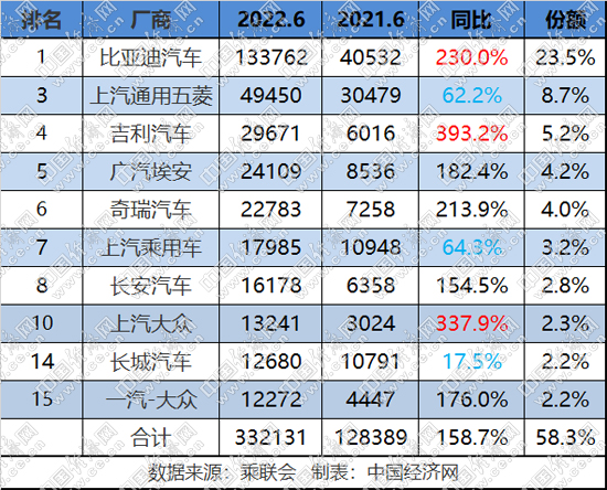 在乘聯(lián)會(huì)發(fā)布的6月新能源乘用車批發(fā)銷量廠商排名(TOP15)中,傳統(tǒng)品牌占據(jù)10席,共計(jì)銷售33.2萬輛,同比增長(zhǎng)158.7%,市場(chǎng)份額接近六成,達(dá)到58.3%,1-6月,傳統(tǒng)品牌新能源累計(jì)銷售144.2萬輛,同比增長(zhǎng)134.4%,份額同樣接近六成,為58.5%。