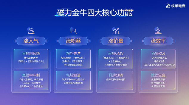 本次活動,快手磁力金牛和快手電商服務(wù)商也宣布推出一系列政策,推動常熟女裝商家電商生意增長。作為電商生意的加速器,快手磁力金牛讓商家投流更精準(zhǔn)、效率更高、效果更好。在賬號啟動期,商家可借助磁力金牛進(jìn)行私域起量,并根據(jù)貨盤制定營銷策略;在賬號成長期,商家可依據(jù)S-A-B直播策略模型,使用磁力金牛進(jìn)行差異化投流、精細(xì)化運營;在賬號成熟期,磁力金??梢栽谄沸f(xié)同下進(jìn)行差異化拓客,引入新流量。