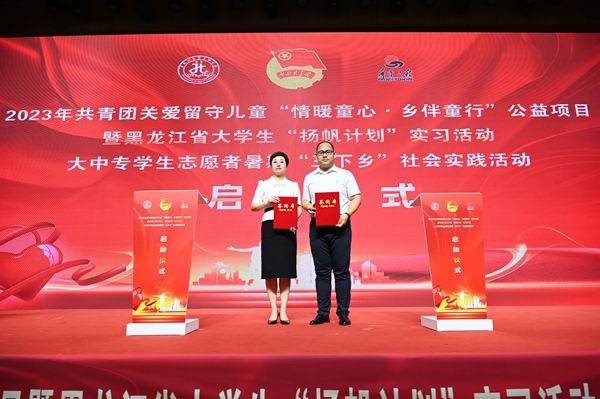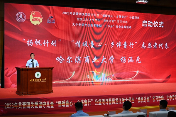 黑龍江經濟網訊(王丹陽 記者祝東)7月5日,2023年共青團關愛留守兒童“情暖童心·鄉(xiāng)伴童行”公益項目暨黑龍江省大學生“揚帆計劃”實習活動、大中專學生志愿者暑期“三下鄉(xiāng)”社會實踐活動啟動儀式在哈爾濱商業(yè)大學隆重舉行。共青團黑龍江省委副書記代東力、陳海平,哈爾濱商業(yè)大學副校長姜國峰,省直機關團工委書記趙明瑞,黑龍江省人力資源和社會保障廳、省知識產權局、省人民檢察院、省青少年發(fā)展基金會、哈爾濱市南崗區(qū)民政局、哈爾濱海關、哈爾濱海事局相關領導,以及哈爾濱商業(yè)大學的志愿者和哈爾濱市樂業(yè)小學師生代表參加本次活動。