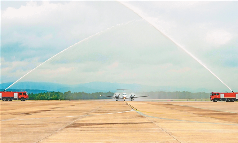 伴隨著飛機的轟鳴聲,命名為“林都號”的國王350飛機平穩(wěn)降落林都伊春,緩緩駛向林都機場5號停機坪。當(dāng)飛機落地脫離跑道后,左右兩側(cè)的消防車開始噴射水霧,兩束水霧相互交錯,以“水門禮”熱烈歡迎乘坐“林都號”來伊春的游客。
