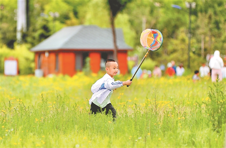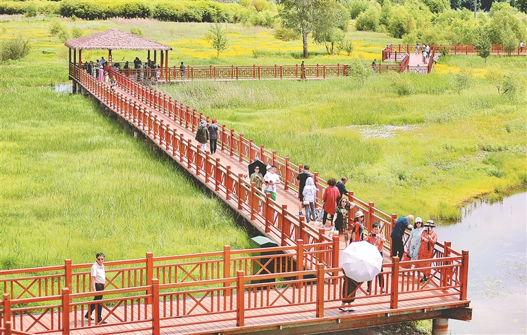 10日,哈爾濱市群力外灘濕地公園內(nèi),許多市民前來(lái)踏青游玩。持續(xù)多日的降雨,使得濕地內(nèi)的植物生長(zhǎng)得更加茂盛,綠樹(shù)如茵、芳草遍地。人們有的走上蜿蜒的棧道觀賞野生鳥(niǎo)類(lèi)和各種水生植物,有的坐在亭臺(tái)里休憩、野餐。孩子們?cè)诓莸厣媳寂苤g笑著,享受踏青帶來(lái)的快樂(lè)。