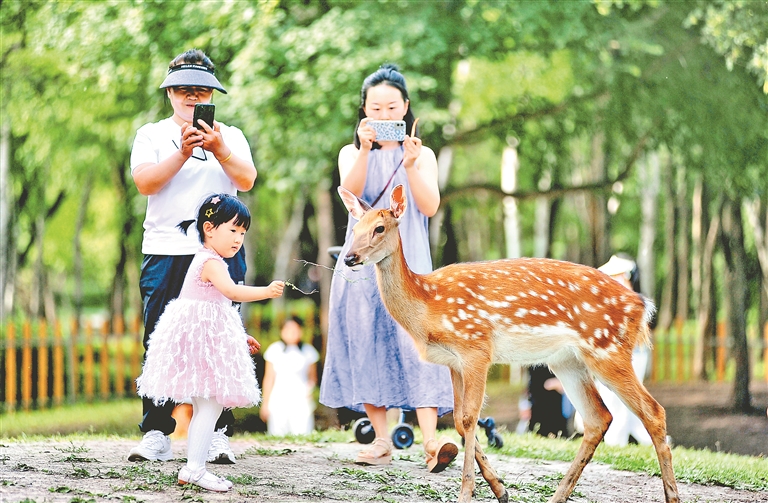 16日,陽光明媚,空氣清新,哈爾濱市迎來了好天氣。太陽島上,草木茂盛,百花爭(zhēng)艷,許多本地市民和南方游客組團(tuán)來到這里避暑游玩。有的游人搭起帳篷野餐,有的游人走上濕地棧道觀賞美麗風(fēng)景。孩子們玩過各種游樂項(xiàng)目后,再與小鹿、松鼠等小動(dòng)物來個(gè)親密接觸。