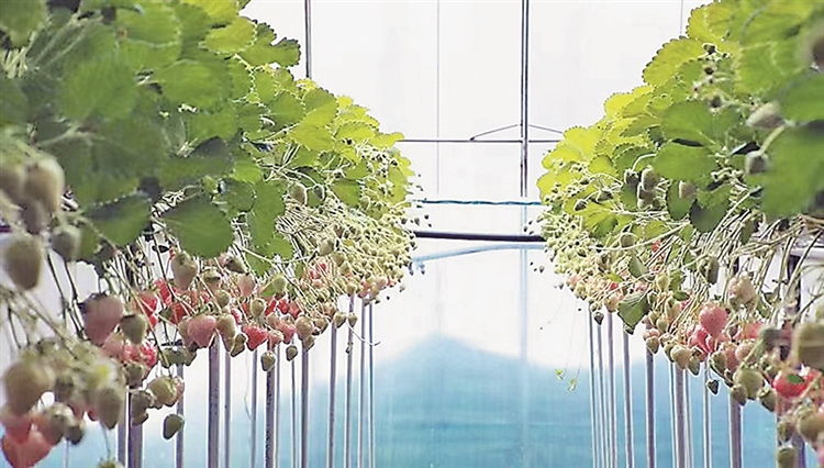 在哈爾濱市香坊區(qū)朝陽鎮(zhèn)的張胖草莓采摘園中,負責人張立元正帶著工人們一起在大棚里查看草莓長勢。這里的草莓秧葉片嫩綠喜人,青白色的果實散發(fā)出淡淡的清香。