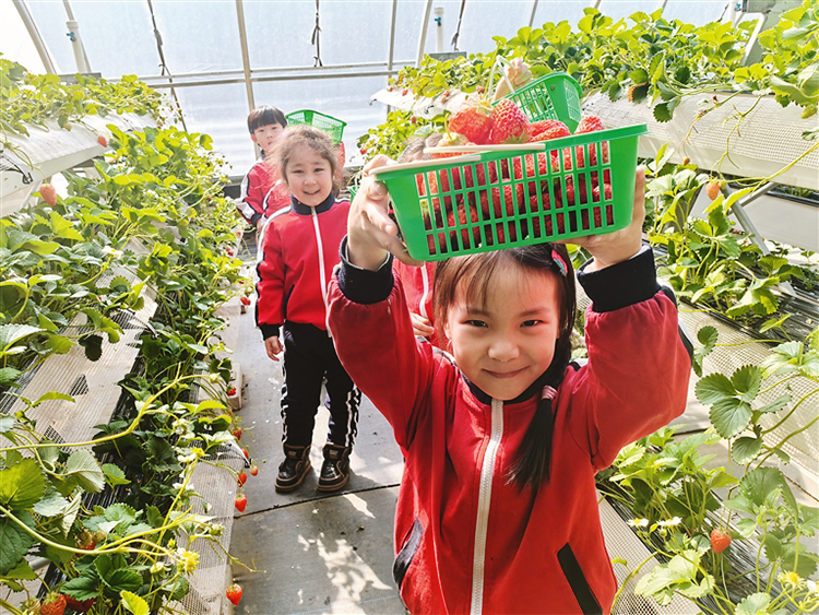 在位于陽明區(qū)樺林鎮(zhèn)的唐櫻園生態(tài)農(nóng)場里,整齊排列著24棟智能溫室大棚。在11號草莓大棚里,來自同心幼兒園的小朋友正在采摘草莓,孩子們興奮地圍著草莓觀察,“草莓真好看,草莓好甜?。 ?/p>