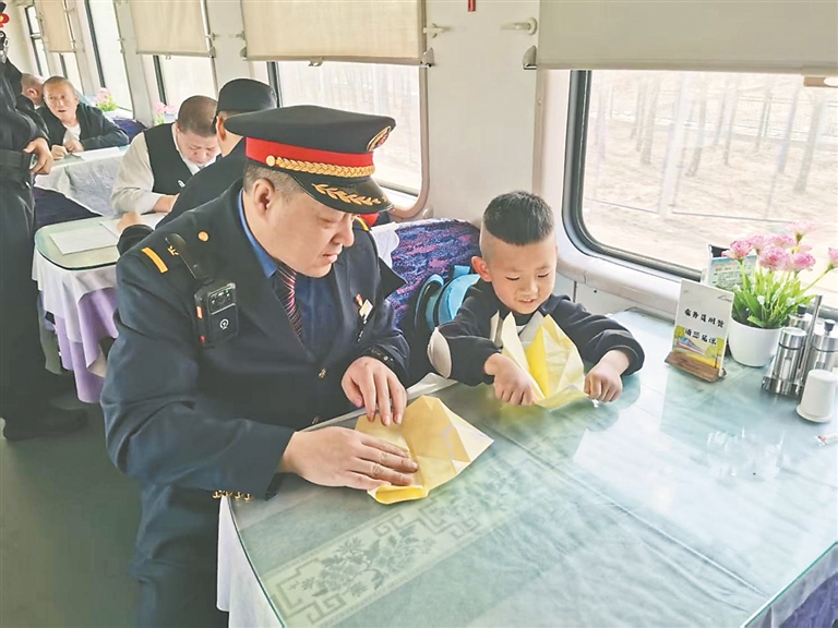 本報(bào)訊(張蔚萌 王夢 記者 王迪)近日,由鄭州開往海拉爾的K927次列車從昌圖站駛出后,列車長孫志強(qiáng)接到12306轉(zhuǎn)發(fā)的緊急尋人求助工單。經(jīng)過與客服溝通了解后得知,旅客劉玲玲帶6歲兒子劉俊澤從沈陽北站乘車至昌圖站,因下車時(shí)忙于整理行李,將座位上熟睡的孩子遺落在列車上。列車長孫志強(qiáng)通過對(duì)講機(jī)立即組織各節(jié)車廂列車員尋找孩子,確定孩子位置后迅速趕到現(xiàn)場。為了緩解孩子的緊張情緒,他化身“臨時(shí)爸爸”,將孩子帶到了餐車,不僅準(zhǔn)備了一些自帶的小零食,還陪孩子一起折紙飛機(jī)。當(dāng)列車??块L春站后,孫志強(qiáng)按照其母親劉玲玲的要求,將孩子安全移交給長春站工作人員,等待其家屬前來接領(lǐng)。