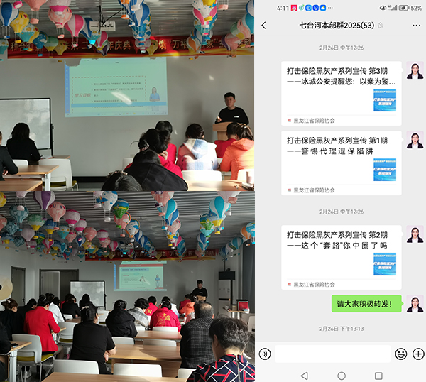 在此次打擊“代理退?!毙麄骰顒?dòng)中,七臺(tái)河中支利用微信工作群、微信朋友圈轉(zhuǎn)發(fā)宣傳內(nèi)容,詳細(xì)剖析了黑灰產(chǎn)的常見運(yùn)作模式,非法“代理退保”可能給消費(fèi)者帶來的四方面風(fēng)險(xiǎn):一是資金受損風(fēng)險(xiǎn);二是喪失正常保險(xiǎn)保障的風(fēng)險(xiǎn);三是個(gè)人信息泄漏風(fēng)險(xiǎn);四是相關(guān)行為可能導(dǎo)致消費(fèi)者面臨訴訟等法律風(fēng)險(xiǎn)。號(hào)召廣大群眾增強(qiáng)風(fēng)險(xiǎn)防范意識(shí),警惕非法“代理退保”套路。
