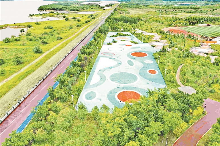 距離體育場不遠,有一處數(shù)千平方米的休閑廣場。廣場周邊新鋪了多條紅色慢行步道,是市民們散步休閑的好去處。在中心區(qū)域,工人們正建設(shè)雕塑,為中外游客打造一處美麗的打卡點。
