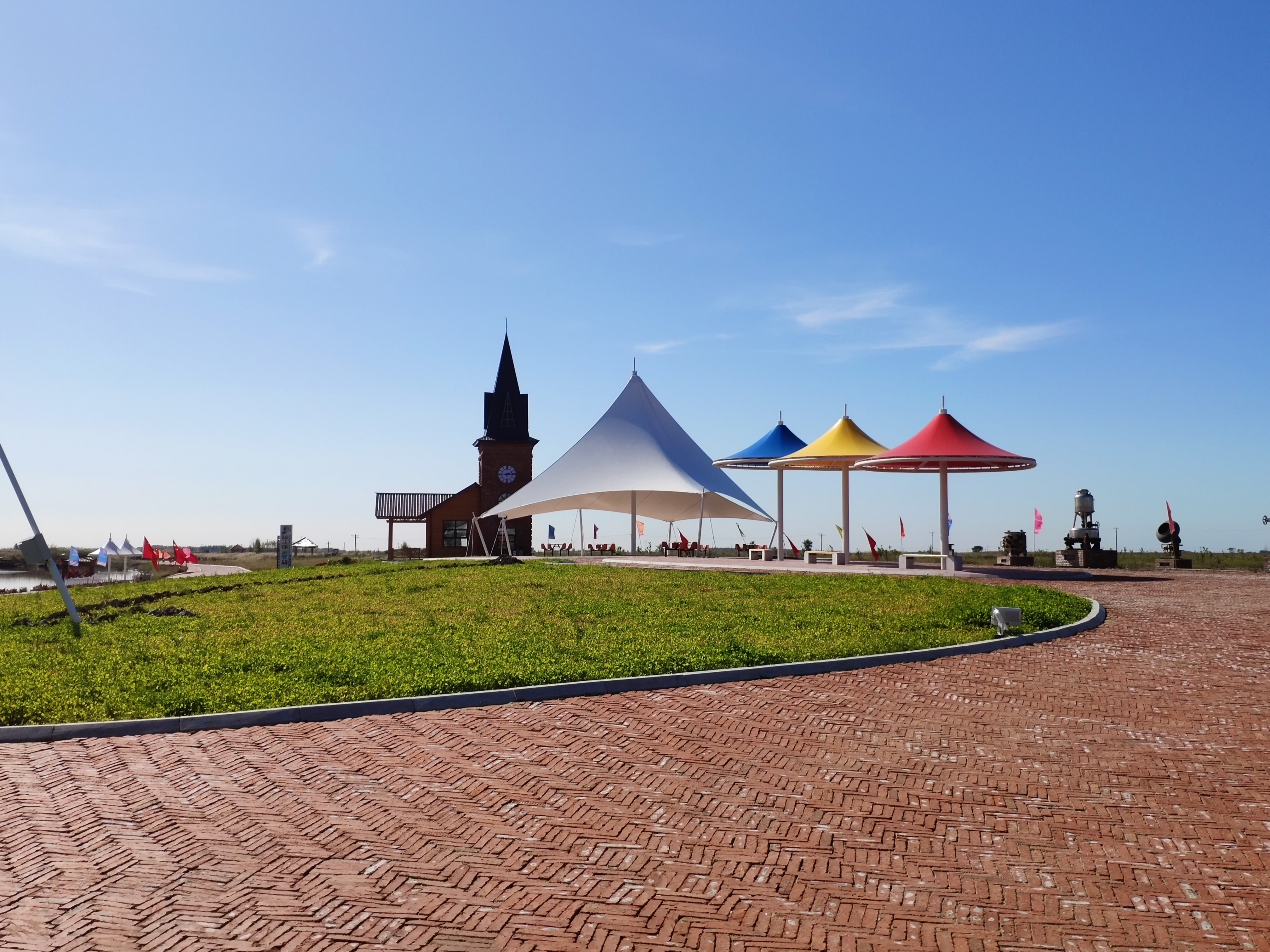 傳統(tǒng)文化廣場以金代文化為主題,廣場中央矗立著仿古城墻雕塑,兩側(cè)設(shè)有民俗展覽館,仿古建筑群與小橋流水相映成趣。休閑廣場以現(xiàn)代簡約風(fēng)格設(shè)計,配備智能健身器材和兒童游樂區(qū),設(shè)有秋千群、帳篷營地,家庭游客可在此野餐、嬉戲。而在位于濕地制高點的觀景廣場,可俯瞰湖光山色。夕陽西下時,霞光與候鳥齊飛,成為網(wǎng)紅打卡點。