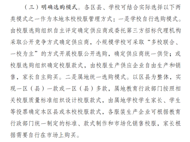 新規(guī)設(shè)計的“自行選購模式”靈活且務(wù)實:規(guī)模較大的學(xué)??勺灾髟u定供應(yīng)商或委托第三方招標;小規(guī)模學(xué)??刹扇 岸嘈B?lián)合、一校為主”的方式降低采購成本;甚至允許“確定款式后,由企業(yè)市場化生產(chǎn)銷售,家長自主購買”。新規(guī)嚴禁“定點”“定商標”干涉交易,不得設(shè)置不合理入圍條件,確保所有合規(guī)企業(yè)都能公平參與競爭。