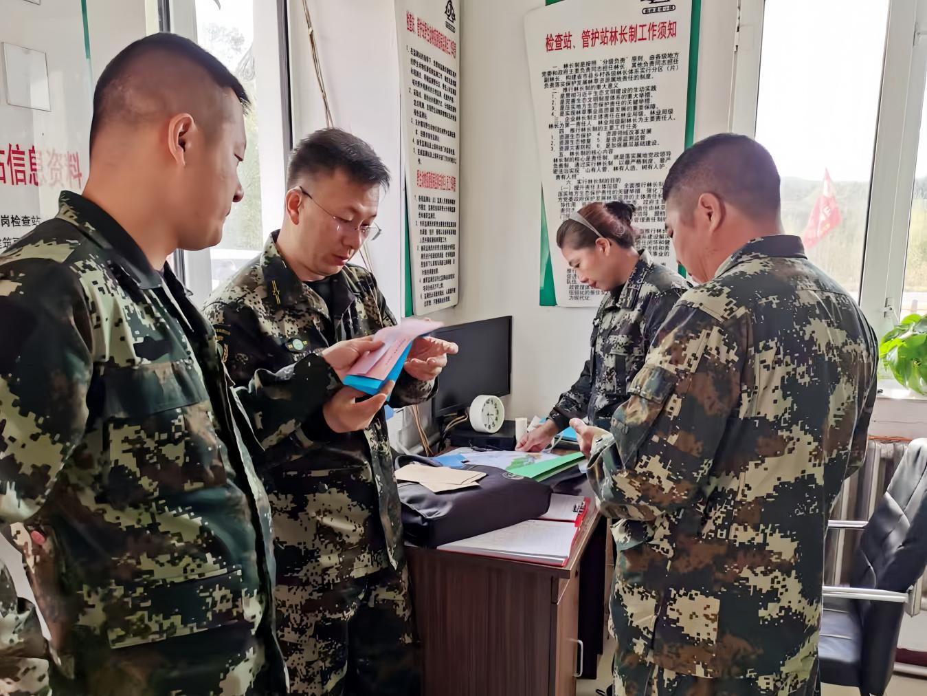 集團(tuán)評審組檢查管護(hù)站的內(nèi)業(yè)建設(shè)(張凱強(qiáng) 攝)