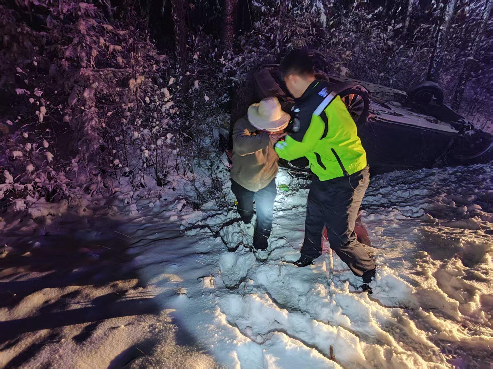 到達(dá)現(xiàn)場后,民警立即下車進(jìn)行查看,發(fā)現(xiàn)一輛外地車牌的小型汽車側(cè)翻在3米的道路下,一對中年夫妻正在車內(nèi)拿取行李箱。見此情形,民警立即向夫妻施以援手,將這對夫妻從溝中拉拽上來,在確認(rèn)二人安全后了解到,二人駕駛車輛從呼瑪趕往漠河,因?qū)β窙r不熟,加之駕駛?cè)嗽诒┞访骜{車經(jīng)驗不足,操作不當(dāng),導(dǎo)致車輛側(cè)翻。