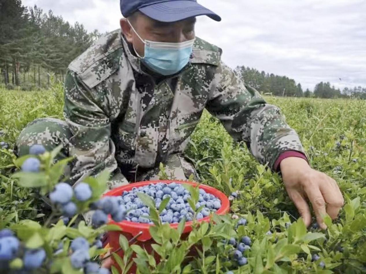 林場(chǎng)工作人員正在采摘藍(lán)莓(時(shí)智超 攝)